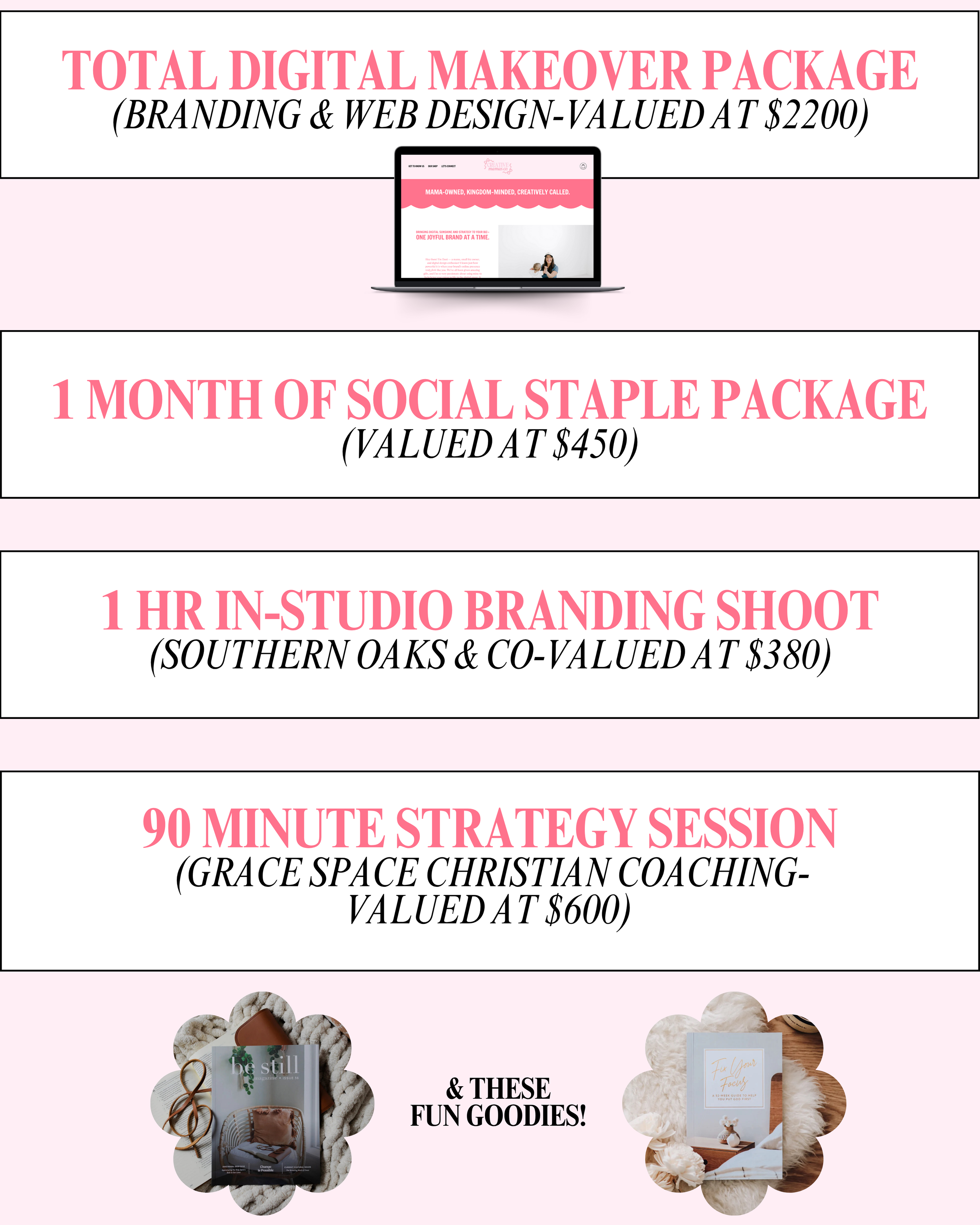 THE ULTIMATE SMALL BUSINESS GIVEAWAY Name * First Name Last Name Business Name * Phone * (###) ### #### Email * Tell Me More About Your Business/Project! * Did you follow: @southernoaksandco, @creativemamasco, @thatcreativemama and @gracespacechristiancoaching? * Yes! No Thank you! THANK YOU SO MUCH FOR ENTERING OUR GIVEAWAY! THE WINNER WILL BE DRAWN ON 08.01.25!